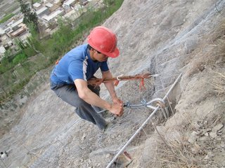 1、边坡防护网施工的测量放线:从防护区域下沿中部开始向上和两侧放线测量确定锚杆孔位,并在每一孔位处凿一深度不小于锚杆外露环套长度的凹坑,一般口径20cm,深15cm。