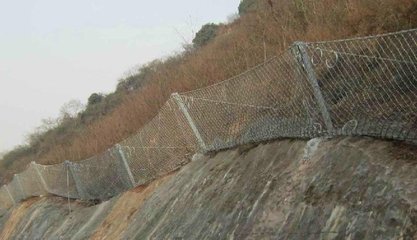 被动防护是由钢丝绳网、环形网、固定系统、减压环和钢柱四个主要部分构成。钢柱和钢丝绳网连接组合构成一个整体,对所防护的区域形成面防护,从而阻止崩塌岩石土体的下坠,起到边坡防护作用。
