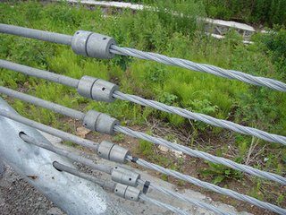 绳索护栏完全依靠缆索的拉应力来抵抗车辆的碰撞,依靠立柱、托架的解体变形、移位及钢索的磨擦来吸收失控车辆的能量。由于钢索在弹性范围内工作,因此事故发生后一般仅需要更换立柱及托架,几乎不需更换钢索即可很快恢复交通。钢索护栏整体性强,具有较好的防盗性能,这使得日常维护工作很简单。